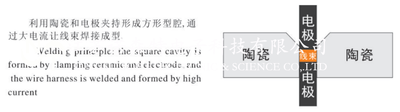 銅線壓方焊接是基于電阻焊接原理,即用電極對被焊接物施加一定的壓力的同時通電、利用電極間的接觸電阻產生的焦耳熱熔化金屬而達到焊接的目的。而壓方成型機的原理是利用陶瓷和電極夾持形成方型腔,通過大電流讓線束焊接成型。